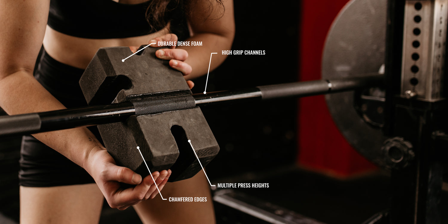 Includes 3 positions equivalent to elevating the bar ½ board (0.75”), 1 board (1.5”) or 2 boards (3”) above the chest.